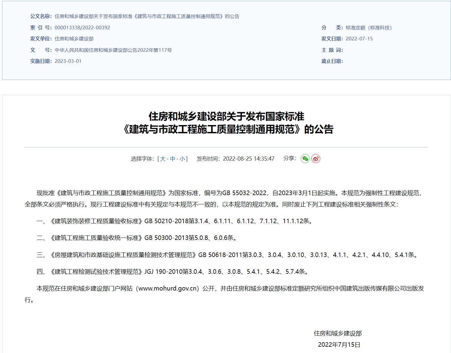住房和城乡建设部关于发布国家标准 《建筑与市政工程施工质量控制通用规范》的公告