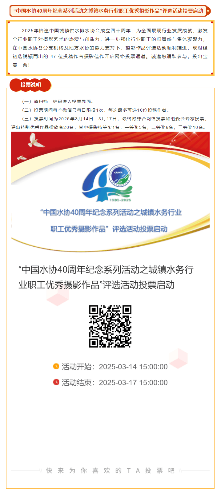 “中国水协40周年纪念系列活动之城镇水务行业职工优秀摄影作品”评选活动投票启动