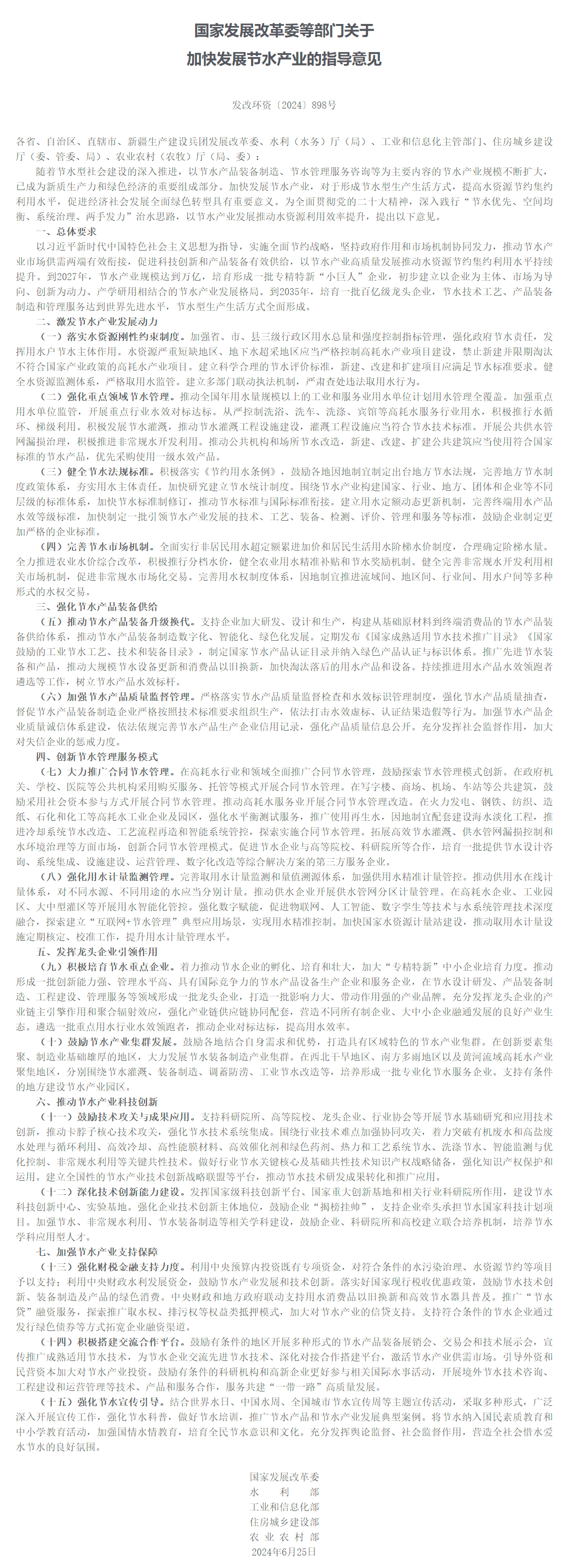 关于加快发展节水产业的指导意见(发改环资〔2024〕898号)