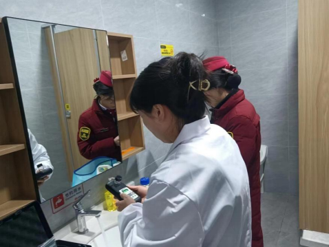 集团水质监测中心工作人员对代表休息场所、会场进行走访对接,取水采样,对水的浊度、细菌总数、余氯含量等各项指标进行检测,确保水质达标。