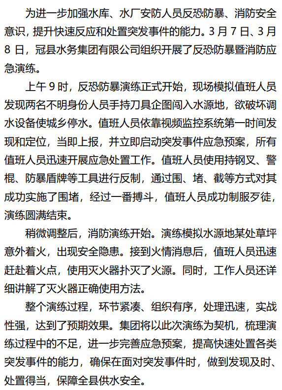 冠县水务集团有限公司开展反恐防暴暨消防应急演练
