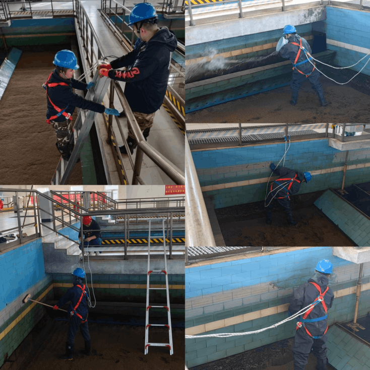 清刷现场,运行一部职工开始清刷1号滤池,其他滤池正常运行。将滤池水位过滤至约三十厘米,职工穿上水裤和胶靴、戴上手套,拿上水桶、钢丝球、抹布、刷子等,系好安全绳,挥舞着手里的劳动工具,开始清刷滤池。由于微生物和药渣牢牢的吸附在池壁上,增加清洗难度。职工先拿大刷子刷去大块附着物,随后用钢丝球一点一点的擦拭池壁,对犄角旮旯清理难度较大的地方,需要深蹲或者侧卧进行清理,给池壁“大洗澡”后,露出池壁本来的颜色。V型滤池进水槽位于两侧,上宽下窄,清刷时不利于站立,头顶是池壁,清刷过程中时不时发出安全帽碰墙的声音,“咚~咚~”声回响在车间,与水流声形成一首美妙的音乐。