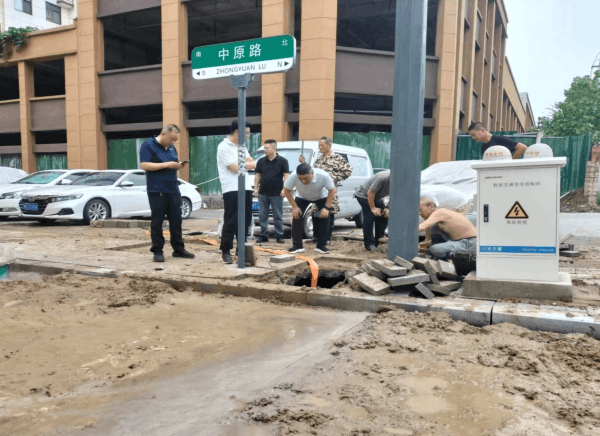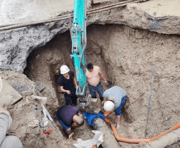 维修部门接到反馈信息后立即指派值班人员前往该区域进行巡查,很快在信合大道与中原路交叉口发现自来水从人行道喷涌而出,路面大量积水。经确认为直径315mm供水主管道漏水。由于该处位置地下管网交错复杂,周边密布电力、燃气、网信、交通等各类管网,交通信号灯正好位于施工作业坑附近,为抢修工作带来极大的挑战。维修人员迅速确定抢修方案,设置安全防护设施,调集挖掘机组织开挖。时值夏季天气高温,为了不影响群众正常用水,维修部门人员轮番上阵,一刻也不停歇,经过5个小时的紧张工作,终于完成抢修保障了周边群众正常用水。