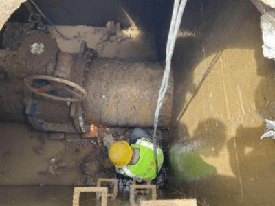 随后,水厂技术人员携抽水设备到现场,迅速组装并启动。因漏水井积泥严重,抢修人员在泥泞湿滑环境中作业。他们凭借经验和协作,为后续抢修创造良好环境。与此同时,抢修中心的技术人员也在紧锣密鼓地制定抢修方案,最终确定切除阀门后端的漏水管道并用盲板进行封堵。