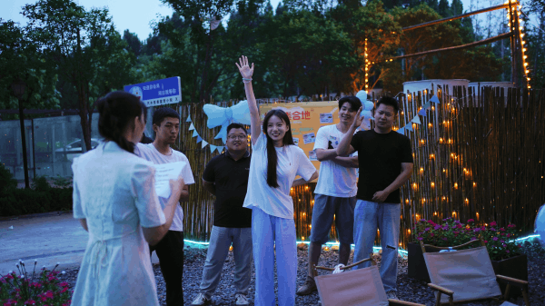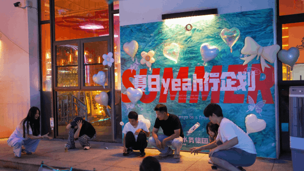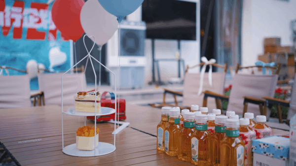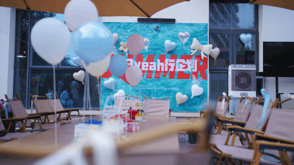 微风中,余晖与云影交织,温热的气息弥漫在曙色中。活动现场的蓝白气球、丝带交错,宛如轻灵的柔雾,带来几分微凉的湿润感,抚平夏日的燥热。