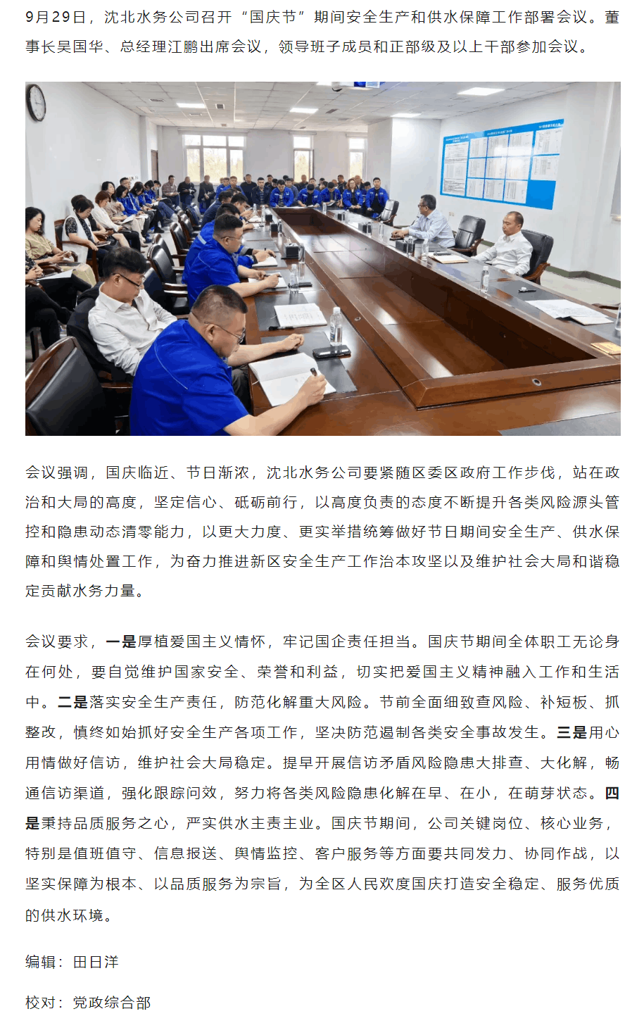 慎终如始抓生产安全 尽心竭力保国庆供水——沈北水务公司召开“国庆节”期间安全供水工作部署会议